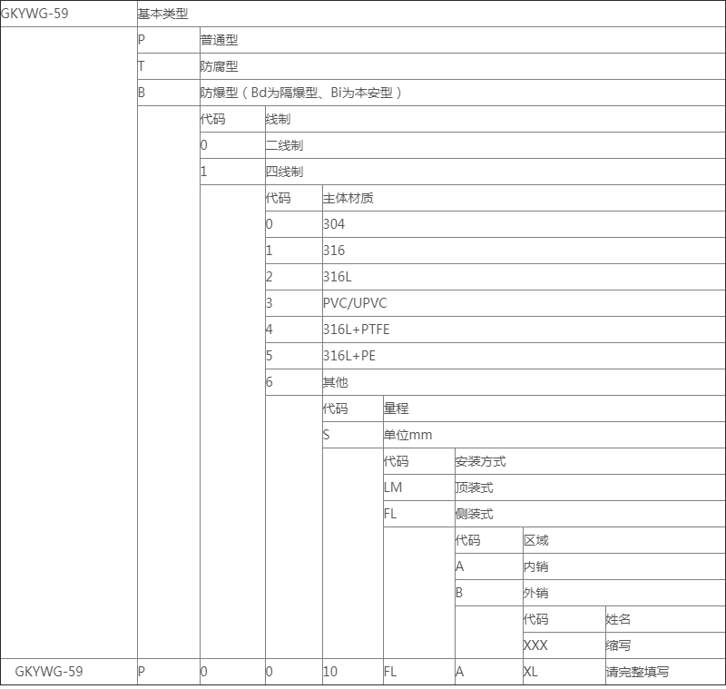 如上表實例:GKYWG-59/P0010FLAXL,P代表普通型,第I個0代表二線制,第II個0代表304材質,1代表10m量程,FL代表法蘭安裝,7m代表罐高,A代表內銷,XL代表徐亮的訂單。
